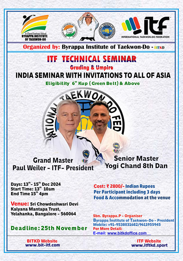 We are pleased to announce that Byrappa Institute of Taekwon-Do will be hosting a seminar with GM Paul Weiler, ITF President and Senior Master Yogi Chand VIII dan