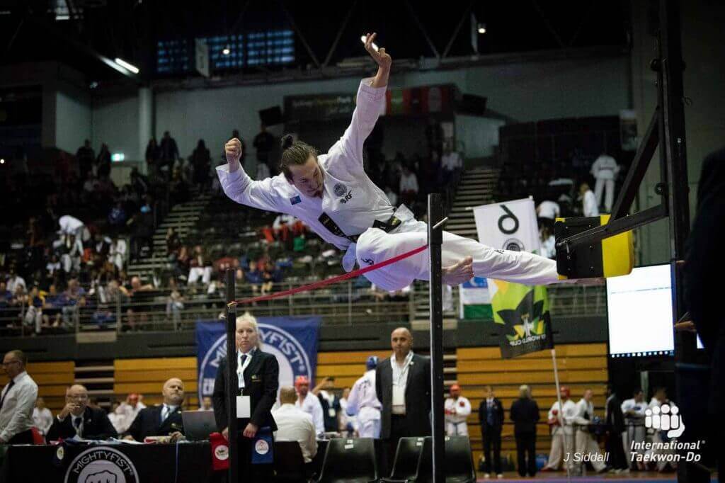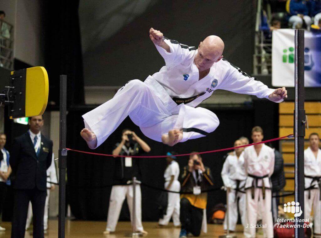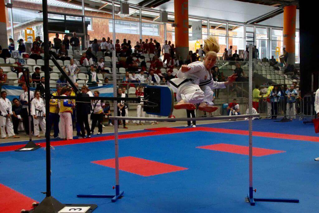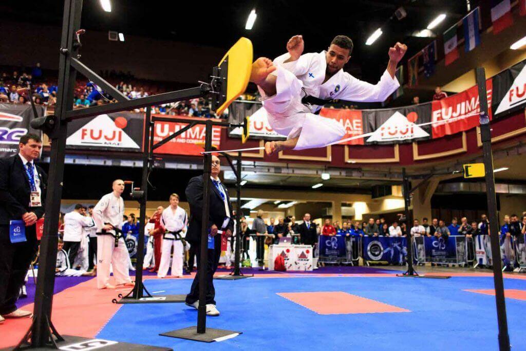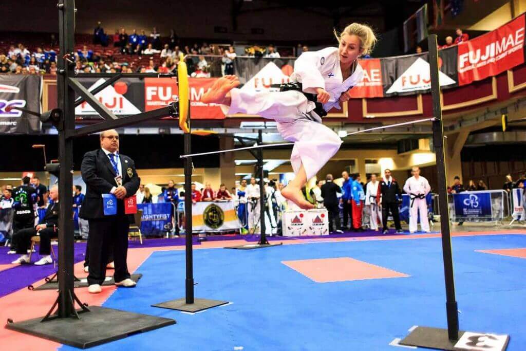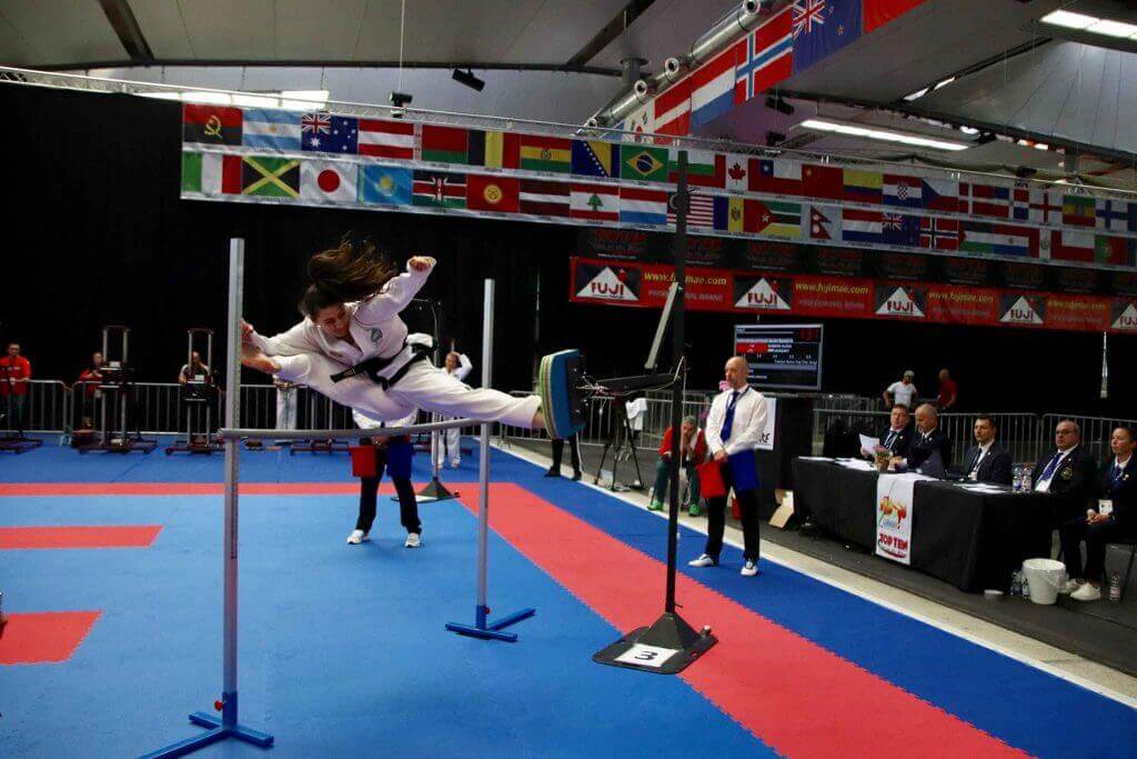 Jump as high or as long as possible and hit or break a board held by specially made stands whilst maintaining correct balance.
