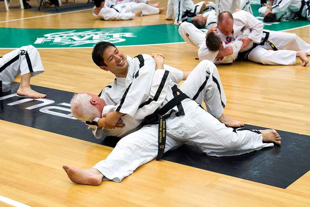Then the fun began as Grand Master Laquerre delivered a ‘warm-up’ that will have the participants feeling their abdominal muscles for the next few years. Grand Master McPhail then delivered a detailed session on step-sparring that helped break the ice between the local attendants and their international visitors. Then it was on to coloured belt patterns and the final session of Day 1, an intense review of the 4th degree patterns for the senior belts with Grand Master McPhail.